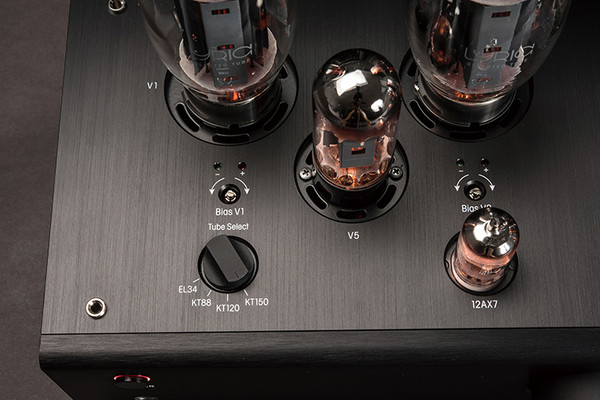 출력관 모두 채널당 2개씩 꽂게 되는데, KT150은 40W, KT120은 38W, KT88은 16W, EL34는 14W 출력을 낸다. 상판 왼쪽의 작은 스위치를 돌려 선택하면 된다. 진공관 투입 물량에 비해 출력이 적은 것은 푸시풀이 아니라 패러럴 싱글, 그러니까 2개 출력관이 병렬로 싱글 구동해 클래스A 증폭을 하기 때문. 진공관 보호를 위해 출력을 보수적으로 설정한 이유도 있다. 초단관은 12AX7, 드라이브관은 6V6을 3극 결속해서 썼다.