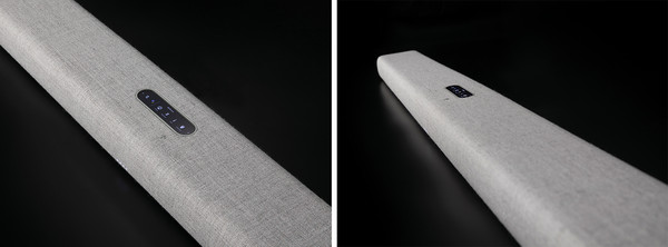 우선 홈 시네마 세트의 소개이다. 우선 이 세트의 핵심인 Bar에 대한 이야기이다. 역시 사운드 바가 패브릭 디자인을 전면에 내세운 경우가 흔치 않은데, 확실히 블랙과 실버 일변도의 디자인보다 훨씬 더 시각적인 만족도가 높다. 특히 슬림한 스타일이라서 공간을 많이 차지 않는 것도 장점. 사실 기능적인 콘셉트는 홈 스피커와 거의 일치한데, 구글 어시스턴트를 탑재하여 음성 제어를 할 수 있고, 멀티룸 사운드를 구성 할 수 있다는 것이 핵심이다. 또한 구글홈과 연동된 스트리밍 서비스를 즐길 수 있고, 블루투스 역시 활용할 수 있다. 홈 스피커의 상위 모델과 마찬가지로 상단에는 컬러 터치 패널 부가 장착되어 있다. 역시 홈 스피커보다 더 많은 기능들을 이곳에서 컨트롤할 수 있는데, 에어플레이, 블루투스, Aux, HDMI ARC의 미디어 소스 선택, 야간 모드의 오디오 설정, 밝기 조절 및 범용 IR 학습, 페어링(서라운드 설정/서브우퍼 페어링)·레벨(스피커 볼륨 트림/저음 레벨 트림/테스트 톤)·립싱크 딜레이·벽 설치 등을 선택·조절할 수 있다. 그러고 보면 사운드바에 액정이 달린 제품 역시 흔치 않은 것 같기도 하다.