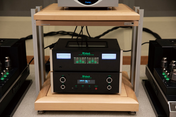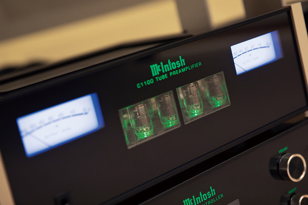 한편 프리앰프인 매킨토시 C1100 역시 엄청난 존재감을 발하고 있다. 전작 C1000보다 더 많은 물량 투입이 이루어졌고, 그에 따른 성능의 향상은 눈이 부실 정도다. 디스토션만 해도 0.005% 이하. 진공관 방식 프리앰프로서는 상상이 가지 않는 스펙이다. 당연히 투 박스 형태. 진공관 프리부에는 진공관과 입력단이 배치되어 있고, 별도의 조작부가 존재한다. 이 조작부에는 2대의 마이크로프로세서가 투입되어 볼륨과 실렉터 등 여러 조작을 정밀하게 관리한다.
