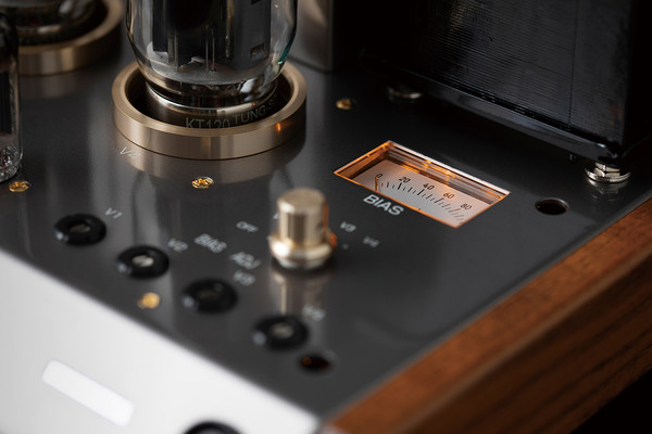 사용한 출력관은 KT120으로 채널당 2개씩 푸시풀 구동하고 있는데, 이 출력관은 가장 많이 사용하는 KT88의 부족한 출력을 채워 주면서 최근 유행하는 KT150보다는 음악성이 돋보이는 출력관이라고 할 수 있다. 특히 이 제품은 KT120 이외에도 호환 가능한 출력관이 많은데, KT88, KT66, 6550, KT77, EL34 등 다양한 출력관으로 변경해 사용할 수도 있다. 그리고 고정 바이어스 방식을 채택했으며, 좌측에 바이어스 조정부를 별도로 만들어 두었고, 바이어스 미터를 장착해 바이어스 값을 쉽게 확인할 수 있다. 그리고 부가 기능으로 후면에 있는 출력 모드 실렉터 스위치를 통해 출력관 결선을 5결 또는 3결 방식으로 선택이 가능하다. 펜토드 모드는 5결 방식으로 100W의 출력이며, 트라이오드 모드는 3결 방식으로 3극관 같은 음색을 경험할 수 있고 70W 출력이다.