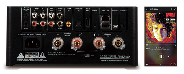 M10은 스트리밍 앰프로 BluOS가 채용되어 타이달, 코부즈, 스포티파이 등 각종 음원 서비스를 지원한다. BluOS 앱으로 스마트폰과 무선 연동되며 멀티 룸, 보이스 어시스턴트 등 다양한 기능을 사용할 수 있다.
