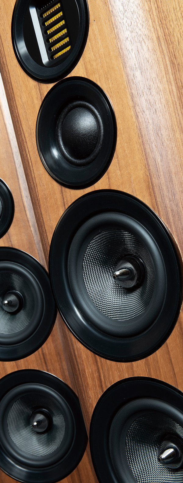 하지만 본 기의 풍부하면서, 고품위한 질감을 얻는 데 일조하는 것은 바로 미드레인지라 하겠다. 놀랍게도 2인치 구경의 소프트 돔이 쓰였기 때문이다. 사실 트위터는 돔 방식이 많지만, 미드레인지로 구성하는 경우는 드물다. 왜냐하면 이런 드라이버는 만들기도 쉽지 않고, 제대로 활용하기에 무척 까다롭기 때문이다. 이 방식의 장점을 살리면서, 전체적인 완성도를 높이기 위해 동사는 꽤나 쇼킹한 방법을 동원하고 있다. 즉, 미드레인지의 활약을 보장하면서도 실제로 크로스오버 포인트는 상당히 좁히는 방식이다.