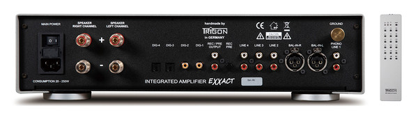 트라이곤의 엑스액트(EXXACT)는 클래스D 앰프로 8Ω에 95W, 4Ω에 130W의 출력을 내며, RCA, XLR 아날로그 입력은 물론 코액셜, 옵티컬 디지털 입력을 갖춘 D/A 컨버터가 내장되어 있고, 옵션으로 포노 스테이지를 더할 수 있다. 헤드폰 출력도 갖췄다.