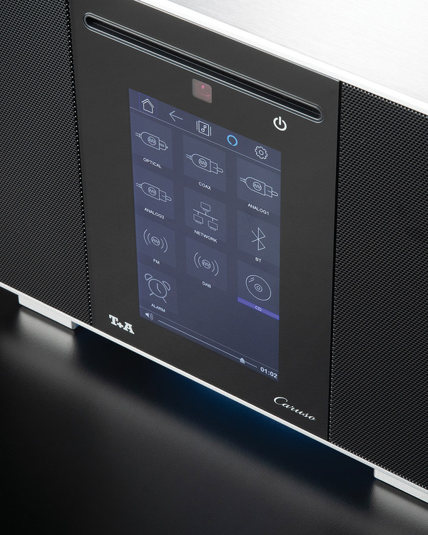 카루소는 오디오와 관련된 모든 기능을 한 몸에 모아 놓았는데, 전면 상단에 CD 로더가 있어 보유하고 있는 CD를 재생할 수 있다. 후면에는 2조의 아날로그 입력, 1조의 아날로그 출력이 있다. 당연히 각종 유·무선 디지털 입력도 지원한다. 옵티컬, 코액셜 입력이 하나씩 있고, USB A 입력으로 USB 메모리 등을 연결할 수 있다. LAN과 WLAN 모두 지원하며 네트워크 스트리밍 재생에 대응한다. 물론 블루투스(aptX) 입력도 갖췄고, FM, DAB+도 들을 수 있고, 헤드폰 출력단도 있다. 그리고 내장 스피커는 전면에 20mm 돔 트위터와 100/40mm 타원형 미드레인지, 하단을 향한 170mm 우퍼로 구성되어 있으며, 이와 같은 구성을 통해 웅장하고 입체적인 소리를 들려준다. 게다가 좌우 측면 쪽에 170mm 패시브 라디에이터 두 개를 추가로 장착해 보다 효율적이고 정밀한 저역을 재생하고 있다. 또한 이를 구동하기 위해 트위터·미드레인지용 50W 출력의 앰프 2개와 우퍼용 100W 출력의 앰프 1개가 채택되어 있다. 놀라운 것은 내부에 내장되어 있는 우퍼가 웅장한 소리를 들려주는데, 이것도 모자라 훨씬 넓은 공간에 사용할 경우를 대비해 서브우퍼 출력도 한 개 마련되어 있다. 따라서 카루소는 파워 케이블만 연결하면 다양한 음악을 즐길 수 있다.