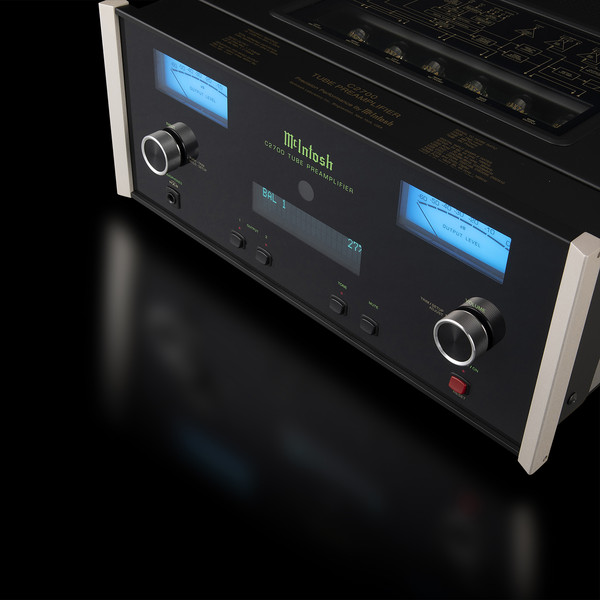 다음으로 C2700 프리앰프의 특징을 정리해 보겠다. 분리형 C1100을 제외하면 일체형 프리앰프 중에서는 가장 상위 프리앰프이며, 5개의 12AX7A와 1개의 12AT7, 총 6개의 진공관을 채용한 아날로그 감성과 DA2 모듈을 통한 최신 디지털 기술이 모두 적용된 동사의 대표적인 프리앰프라고 할 수 있다. 그리고 변함없는 매킨토시 스타일을 강조한 블랙 글라스 전면 패널과 그린 라이팅 로고, 알루미늄 엔드 캡 노브 등을 통해 고전적인 스타일을 고스란히 느끼게 했다. 제품 상단은 시스템 블록도와 6개 진공관이 그린 라이팅으로 아름답게 디스플레이되어 있는 동사 진공관 프리앰프의 특유의 디자인 콘셉트로 되어 있다.