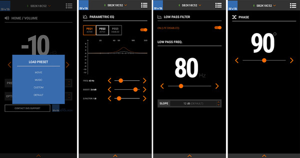 두 번째, SVS의 최대 장점은 다기능과 전용 어플의 사용이다. 이를 위해 아날로그 디바이시스 사의 DSP를 탑재해 서브우퍼의 모든 기능을 직접 컨트롤할 수 있다. 기본 설정은 후면 패널의 ICI(Intelligent Control Interface)로 가능하지만, 상세 설정은 청취 위치에서 스마트폰과 블루투스 연결로 전용 앱을 통해 손쉽게 설정할 수 있다. 프리셋을 통해 음악, 영화, 게임에 최적화된 튜닝 그래프를 선택하고, 사용자가 직접 상세 설정도 가능하다. 게인, 크로스오버 주파수, 1도 단위의 위상, 정교한 3밴드 파라메트릭 EQ를 통한 주파수 슬로프와 Q 팩터 조정도 가능하다. 이 정도로 친절한 서브우퍼 툴은 본 적이 없는데, 필자 같은 사운드 엔지니어에게는 더없이 좋은 흥미진진한 기능이 아닐 수 없다.