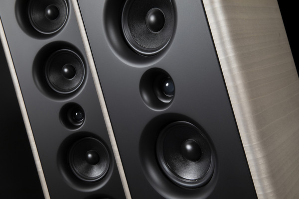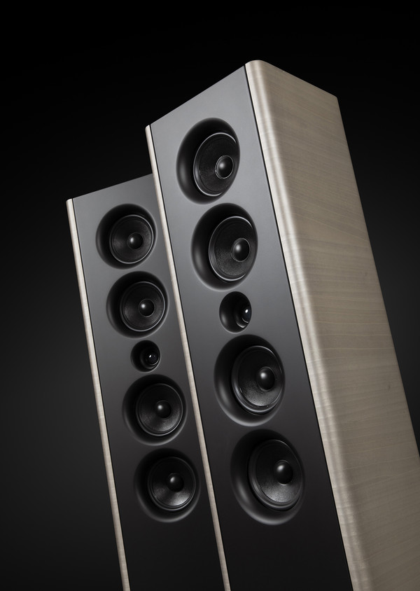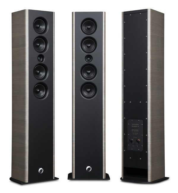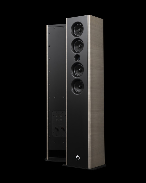 스피커는 앰프의 대성공 이후 개발된 것으로, 역시 앰프 못지않은 신 설계로 무장되어 있다. 마하(Mach) 시리즈가 간판 모델인데, 모두 우퍼와 트위터가 어레이 형태로 다량 배치되어 있고, 순수 알루미늄 인클로저 버전과 우드 인클로저 버전으로 구분되어 있다. 이번에 시청한 모델은 우드 인클로저 버전의 매트 마감. 우아하게 은은한 회색이 감도는 컬러링이 미려하다.
