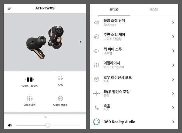 스펙은 정말 만족스럽다. 요즘 한참 화제가 되는 스냅드래곤 사운드 및 aptX 어댑티브를 장착했다. 최대 24비트/96kHz를 지원하는 셈인데, 지원하는 기기만 있다면 ATH-TWX9를 풀 스펙으로 즐길 수 있다는 것이다. 360 리얼리티 오디오 역시 담아냈다. 이름 그대로 360도 입체 음향 기술인데, 실제 경험해보면 정말 새로운 감각의 효과이다. 처음 기능을 활성화할 때 귀 모양을 찍어야 하는 것도 이채롭다.