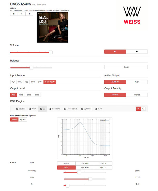 마지막으로 살펴볼 부분은 ‘웹 인터페이스’ 기능이다. 동일한 공유기 환경의 PC에서 할당된 IP를 입력하면 바로 웹 인터페이스의 다양한 세팅을 사용할 수 있다. 물론 사용을 위해서는 충분한 이해가 필요하다. 바이스의 기술을 통해 DSP로 구현된 ‘플러그 인 방식’ 기능들을 사용해 보면 제품의 활용도가 한층 다채로워진다. 주목할 만한 기능을 요약해 보면, 치찰음을 제어하는 De-Essing와 스톡피쉬 레이블의 에뮬레이션을 채용해 LP 사운드 특성을 제공한 Vinyl Emulation, 3밴드 파라메트릭 방식의 EQ와 크로스토크 캔슬링을 위한 XTC 기능이 가장 돋보이는 플러그 인이다. 단지 다이내믹과 라우드니스 EQ는 리미트가 바로 걸릴 수 있어 충분히 사용 방법을 인지한 뒤 신중한 사용이 필요하다. 이 밖에도 룸 EQ도 제공하기 때문에 5밴드로 리스닝 환경의 컨디션을 조정할 수도 있는데, 별도의 오디오 인터페이스와 캘리브레이션 마이크가 있다면 사용해 볼 만하다.