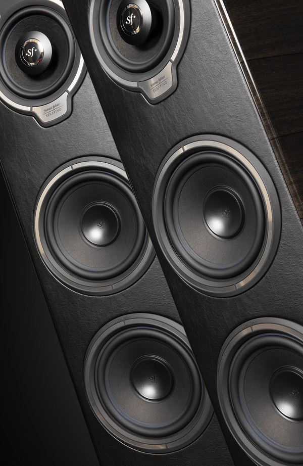 다음은 사용된 드라이버들인데, 트위터는 28mm 사이즈로 중앙에 뾰족한 화살표 포인트 플러그가 장착된 D.A.D. 타입으로, 고역에서의 위상 틀어짐과 디스토션을 방지하고 있다. 가장 큰 변화는 미드레인지로, 세라피노 G2에는 아마티 G5와 동일하게 새롭게 개발된 미드레인지가 장착되었다. 150mm 사이즈의 이 미드레인지는 새로운 페이즈 플러그를 추가해 중역 위상 문제 해결과 명료도를 높였고, 네오디뮴 자석과 새로운 보이스 코일을 채용해 빠른 반응을 얻었으며, 서스펜션도 개선했다. 그리고 크로스오버 중첩 주파수 대역은 딥 현상 없는 자연스러운 주파수 커브를 만들어 기존 미드레인지보다 중역 레벨을 향상시켰다. 또한 미드레인지와 트위터에 별도의 독립적인 인클로저 용적을 만들었고, 여기에 인토노 기술을 적용해 미드레인지에서 트위터 방향으로 내부에 덕트를 별도로 추가해 내부 압력을 감소시켜 착색이 없는 중역을 들려준다. 저역용으로 장착된 두 개의 우퍼는 180mm 사이즈로, 내부 보이스 코일과 스파이더에 새로운 소재를 적용했고, 강력한 네오디뮴 마그넷을 사용했으며, 마그넷 후방에 공냉식 캡을 설치해 빠른 반응과 에너지 넘치는 저역을 만들고 있으며, 아마티 G5와 동일한 소재들을 적용하면서도 사이즈는 줄여 실제 구동은 더욱 수월해졌다.