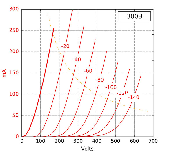 스펙을 확인해보니 올닉 300B는 전압 증폭률(뮤)이 3.8, 전류 증폭률(gm)이 5.0mA/V, 내부 저항(Rp)이 770Ω을 보인다. 확실히 3극관답게 내부 저항이 1㏀이 안 될 정도로 낮다. 플레이트 손실은 40W, 플레이트 전압은 450V, 플레이트 전류는 고정 바이어스 방식일 때 70mA, 자동 바이어스일 때 100mA를 보인다. 필라멘트 히팅 전압은 5V.