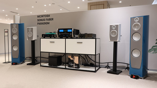 로이코 부스는 국내에서도 인기 높은 다양한 하이엔드 브랜드들을 들고 나왔다. 매킨토시, 패러다임, 소너스 파베르, 린 등을 만날 수 있었는데, 역시 하이엔드 오디오 쇼에 걸맞은 그레이드를 보여주는 세팅 능력을 보여주었다. 오픈 부스에는 정말 매력적인 블루 색감을 보여주는 패러다임의 페르소나 7F 스피커가 압도적인 자태를 보여주었고, 또 하나의 북셀프 매력기 페르소나 B 스피커가 자리했다. 매칭 앰프는 매킨토시의 플래그십 인티앰프 MA12000이 중심을 잡았고, 매킨토시 MT5 턴테이블과 린의 셀렉트 DSM이 소스기기로 동원되었다. 부스 입구에는 요즘 한창 화제를 불러일으키고 있는 매킨토시의 MTI100 일체형 턴테이블이 시선을 끌었다.