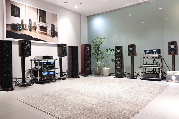 사운드솔루션으로 넘어가면, 이쪽은 탄노이의 압도적인 웨스트민스터 로열 GR을 만날 수 있다. 특별히 매킨토시의 주력기들이 모두 동원되었는데, 매킨토시 C12000 프리앰프, MC1.25KW 파워 앰프, MCD600 소스기기, MR89 튜너까지 매칭되어 웨스트민스터의 진수를 접할 수 있었다. 전용 시청룸에는 탄노이의 턴베리 GR이 자리했고, 스테레오 230, 스테레오 130, CDT의 리크 세트들이 대거 세팅되었다.
