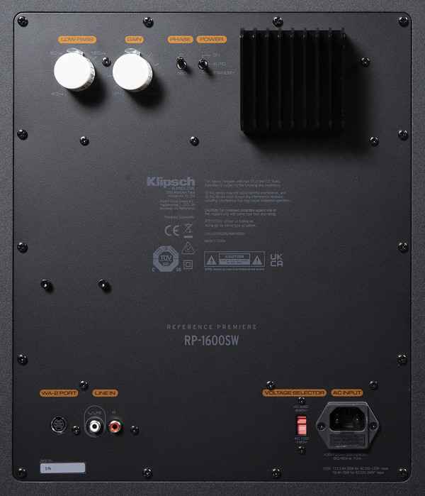 RP-1600SW의 뒤쪽에는 로우 패스 주파수(40-150Hz, LFE)와 게인(MIN-11)을 조절할 수 있는 노브가 있는데, 특이하게 돋보기가 부착되어 있어 보기가 쉽다. 그리고 위상도 0, 180°로 조절할 수 있는 스위치도 있고, 전원도 스위치로 On, 오토, 스탠바이로 설정할 수 있다. 또한 입력은 RCA 단자로 되어 있으며 L/LFE, R로 구분되어 있다. 그리고 옵션으로 준비되어 있는 WA-2 무선 서브우퍼 키트를 연결할 수 있는 WA-2 포트가 있다. 여기에 WA-2를 연결하면 이 서브우퍼에 무선 기능을 추가할 수 있어 서브우퍼 케이블이 필요 없으며, 케이블이 없어 서브우퍼의 배치를 더욱 쉽게 할 수 있어 매력적이다. 특히 음질이 저하되지 않는다는 사용자의 평도 있으니 도입해 보는 것도 좋을 것 같다. 게다가 입력 전환 없이 RCA와 WA-2 입력을 모두 활용할 수 있으므로 같은 공간에서 이 서브우퍼에 여러 시스템을 함께 연결해 사용할 수 있기도 하다.