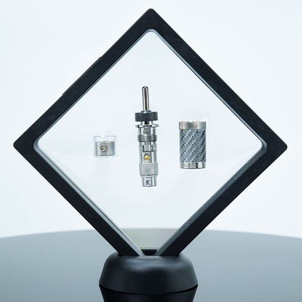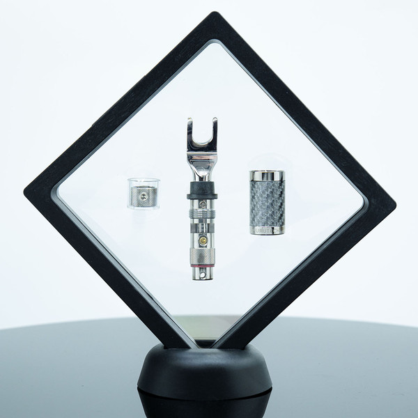 분해도를 보면 이 자그마한 단자 하나가 상당히 복잡한 구조로 되어 있는 것을 알 수 있는데, 먼저 스피커와 결합되는 부분과 선재가 결합되는 부분이 α(알파) 순동을 사용해 일체형 구조로 만들어져 있고, 로듐 도금이 되어 있다. 이 부분과 결합되는 NCF 댐핑 링은 다중 복합 수지로 제작되어 있는데, 압전 댐핑 특성을 위해 액정 폴리머(LCP)에 나노 크기의 세라믹 입자 및 카본 파우더가 결합되어 있고, 정전기를 제거하고 열, 기계 및 전기 에너지를 상호 변환하며 진동을 감쇄시키는 NCF도 결합되어 있다. 하우징은 비자성 스테인리스 스틸로 만들어지며 그 위에 하이브리드 NCF 은도금 3k 카본 파이버 레이어가 더해지고 또 그 위에 하드 클리어 코팅이 되어 있다. 본체는 α(알파) 비자성 스테인리스 스틸로 만들어 졌으며, 지름 최대 5.5mm의 연선을 압축하는 클램프는 특수 스테인리스 스틸로 만들어 졌다. 그 외에도 선재의 절연체를 잡아 주는 하우징과 하우징 절연 링, +와 -를 표시하는 알루미늄 컬러 링 등 여러 요소가 결합되어 있다.