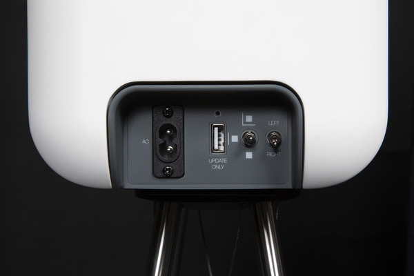 스피커 후면을 살펴보면 하단부에는 전원 케이블을 연결할 전원 단자, 스피커의 배치에 따라 저역을 세팅을 할 수 있는 스위치와 스피커 좌, 우 채널 선택 스위치가 배치되어 있다. 그리고 펌웨어 업데이트 시 사용되는 USB 단자도 배치되어 있다. 후면 상단부에는 다양한 버튼이 배치되어 있고 이를 통해서 조작도 가능. 하지만 메인 기기로 컨트롤되기 때문에 스피커에서는 초기 세팅 외에 실제 사용에서는 별다른 조작이 필요 없다.