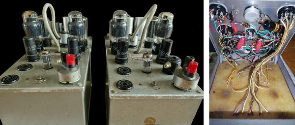 매킨토시 50W-2 모노 파워 앰프에 대해 좀더 탐구해 보자. 이 앰프는 군용 통신 장비의 외관을 이어받는 듯 알루미늄 케이스 2개에 나뉘어 담겨 있고, 높이는 요즈음 출시되는 진공관 앰프의 두 배 정도다. 이 앰프가 높게 설계된 것에는 특별한 이유가 있다. 바로 모든 트랜스가 케이스 아래부분에 담겨 있기 때문이다. 앰프의 하부에는 전원과 초크 부분, 출력 트랜스와 중간단(인터스테이지) 트랜스가 단단한 수지 물질로 각각 함침되어 있다. 70년의 세월을 이기고 이 앰프가 좋은 소리를 낼 수 있는 배경에는 트랜스류의 내구성과 잘 함침된 수지의 역할이 클 것 같다. 실버 햄머톤 도장의 상판에 체결된 나사 네 개만 풀면 진공관 소켓과 저항, 커패시터, 와이어가 결선된 상·하부가 가볍게 분리된다. 회로 설계도 비교적 단순하다. 12AX7 쌍삼극관으로 위상 반전을 하고, 15㏀ 부하 저항 양쪽에서 위상이 180도 바뀐 신호를 각각 인출해 두 개의 6J5 드라이브 관으로 보낸다. 드라이브단의 신호는 중간단(인터스테이지) 트랜스를 거쳐 출력관인 6L6-G에 이르게 된다. 여기서 생성된 높은 임피던스의 출력은 출력 트랜스를 거쳐 연속 최대 출력 50W로 스피커를 구동한다. 잘 만들어진 인터스테이지형 파워 앰프는 대역 분리와 높은 입력 감도로 인해 악기 간 분리가 좋은 장점이 있다. 여기에 소리의 밀도 역시 전 주파수 대역에 걸쳐 빈 곳이 없이 촘촘하게 소리를 재생한다.