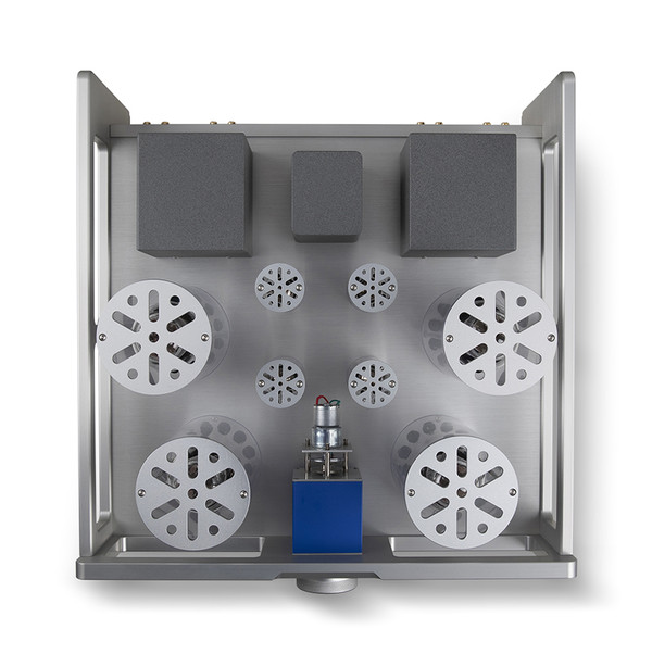 오픈된 상판을 보면 양 사이드에 출력관 300B가 채널당 2개씩(SEPP), 가운데 앞쪽에 초단관 ECF802가 채널당 1개씩, 그 뒤에 드라이브 및 위상 반전관 6211(E80CC)이 채널당 1개씩 자리 잡고 있다. 출력 트랜스가 없는 OTL 앰프는 출력관의 내부 저항과 출력 임피던스가 낮아야 착색이나 왜곡 없이 파워 앰프를 강력히 드라이빙할 수 있는데, 직열 3극관 300B는 내부 저항이 700Ω으로 낮은 대표 진공관이다.