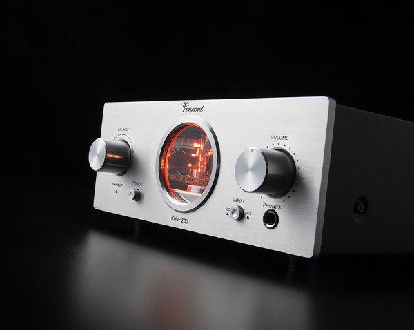 빈센트(Vincent) KHV-200은 가로 21cm 정도로, 전형적인 하프 사이즈의 헤드폰 앰프이다. 디자인은 한눈에도 빈센트 제품이라는 생각이 들 정도로, 빈센트 특유의 패밀리룩을 보여준다. 동그란 대형 투명 창에 진공관이 훤히 보이는 레이아웃인데, 이는 빈센트 하이브리드 라인업의 핵심 아이덴티티이기도 하다. 이 기기에 ECC82 1개와 E180F/6SCH9P 2개가 채용되었으며, 동그란 창으로 ECC82 진공관을 확인할 수 있는데, 제법 밝게 빛나는 불빛이 꽤 매력적이다.