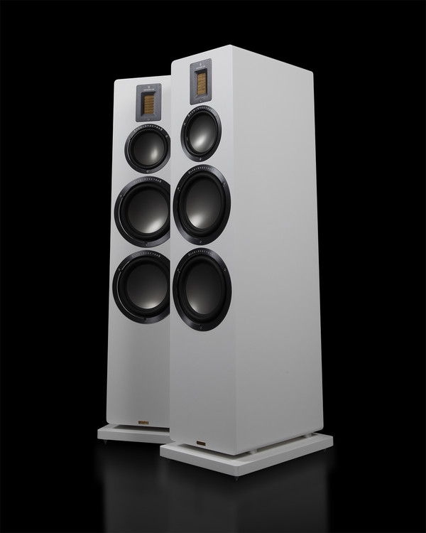 이 스피커는 특별한 것 하나가 눈에 띄는데, 바로 AMT 앞에 있는 로즈 골드 도금된 분산 망이다. 이것은 S-Stop 필터라고 하며, 녹음 시 사용되는 팝 필터에 영감을 받아 제작된 것으로 치찰음을 제어하는 데 도움이 된다고. 미드레인지와 베이스 드라이버도 특별한데, 기왕의 이전 시리즈 제품에서 다소 딱딱한 음감이 나타난다는 약점을 해결하기 위해 항공 우주 등급 알루미늄의 강도와 부드러운 소재의 뛰어난 내부 감쇠 특성을 결합한 새로운 샌드위치 멤브레인을 개발, 왜곡을 매우 낮춘 3층 샌드위치 멤브레인이 탄생했다. 미드레인지와 베이스 드라이버 모두 두 개의 얇은 알루미늄 껍질 사이에 댐핑 재료 층이 샌드위치된 복합 콘으로 되어 있으며, 높은 수준의 강성과 낮은 공명을 결합하는 기술인데, 풍부한 디테일과 함께 해상도가 증가하는 특징을 가지고 있다. 베이스 리플렉스 포트는 바닥에 있어서 메인 캐비닛과 그것을 지지하는 받침대 사이의 작은 틈새를 통해 배출된다. 이 위치도 독특하다. 이러한 배열은 스피커 배치에서 상당히 자유롭다. 시청 위치에 따라 달리 각도를 맞추는 데도 까다로운 스피커가 많지만 시청기는 그런 면에서도 상당히 자유롭다. 이는 AMT 트위터의 넓은 분산 효과 때문.