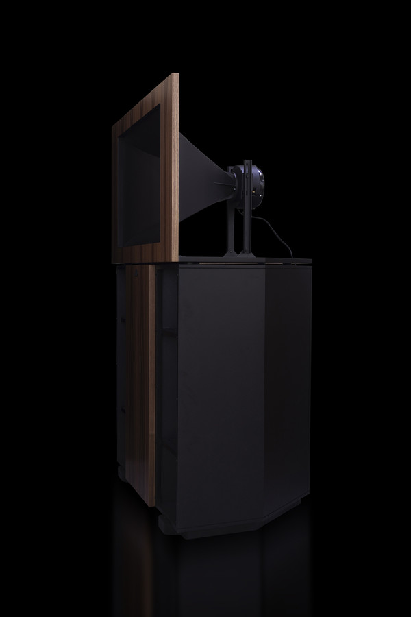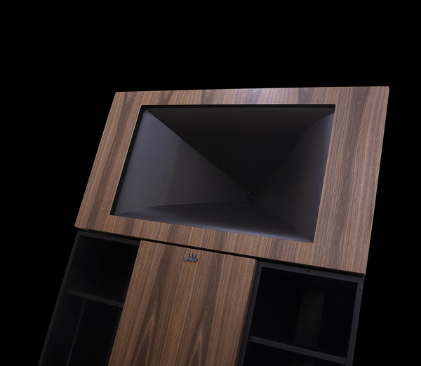 디자인은 누가 보아도 압도적. 180cm에 달하는 거대 스피커는 혼 스피커의 새로운 왕좌임을 알려준다. 실제 보면 더 거대하고 압도적이다. 상단은 대형 혼이 유려한 우드 베니어 속에 담겨 있는데, 5인치 대형 보이스 코일이 적용된 K-693 7인치 티타늄 다이어프램이 채택된 모습이다. 하단은 12인치 사이즈의 듀얼 K-283이 채용되어 있는데, 여기에는 클립쉬가 자랑하는 인클로저의 복잡한 미로 패턴이 적용되어 있다. 이른바 ‘Horn-Loaded Vented System’의 원류를 즐길 수 있는 부분. 저음의 효율은 물론이고, 다이내믹과 깨끗함까지 상승시키는 효과를 가져오며, 왜곡을 최소화하는 것도 큰 장점이다. 이를 통한 주파수 응답은 18Hz-20kHz, 가장 이상적인 스펙을 이 대형기에서 맛볼 수 있다.