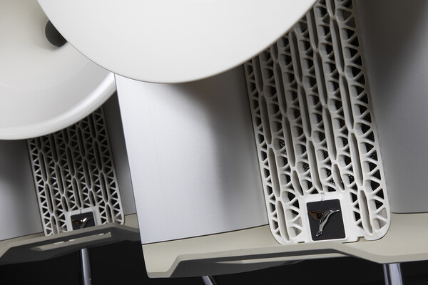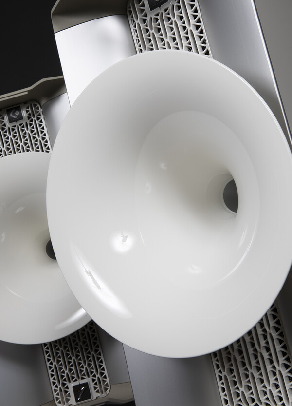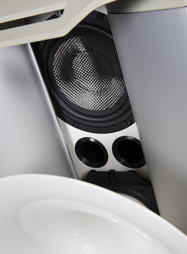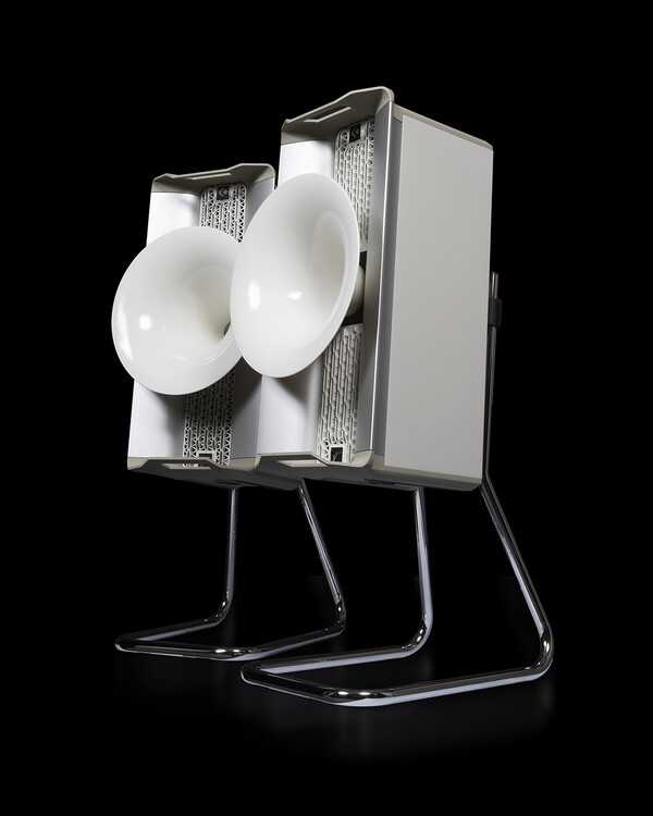 디자인도 확 달라졌다. 직사각형 레이아웃에, 중심부의 대형 혼, 독특한 그물 구조의 패널, 그리고 유니크한 스탠드까지, 기존 아방가르드와는 확실히 다른 모습. 특히 세로형뿐만 아니라, 가로형으로도 세팅할 수 있는 기믹이나, 스탠드 및 벽에 걸 수 있고, 아래 쪽에 서브우퍼를 추가하여 아예 체급을 키우는 레이아웃 등 새로운 아이디어들도 잔뜩 포함되어 있다.