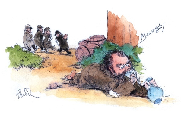 끝으로 다시 작곡가로 돌아가서, 이번에는 술을 먹은 것이 아니라 술에 먹힌 케이스다. 러시아의 국민악파(國民樂派) 5인조의 한 사람인 작곡가 무소르그스키(Modest P. Musorgsky, 1839-1881)가 바로 그 사람이다. 그가 최초로 건강을 해 정도로 술을 마신 것은 26세 때였는데, 그 때는 어머니를 잃고 그 슬픔을 달래기 위해서였다. 이후로 무슨 일이 생겼다 하면 마구 술을 마시게 되었고, 가장 즐겼던 술이 러시아의 보드카였다. 동양에서는 '화주(火酒)'라고 번역될 정도로 센 술이며, 알코올 도수가 40도에서 60도 정도나 되니까 주로 북쪽의 추운 나라에서 애음되는 술이다. 필자도 러시아, 핀란드 등의 나라를 여행했을 때는 즐겨 마셨는데, 워낙 도수가 높으니까 조심해서 마셨다. 무소르그스키가 35세 되었던 1874년 2월 8일 페테르부르크의 마린스키 극장에서 오페라 <보리스 고두노프>가 초연되었는데, 지금은 그의 대표작으로 높이 평가되고 있지만 당시에는 너무도 새롭고 시대를 뛰어넘은 것이었기에 대중의 인기도 얻지 못했고, 5인조의 동료들로부터도 이해를 얻지 못했다. 그리하여 무소르그스키 정신적으로나 물질적으로나 곤경에 빠지게 되어 점차로 음주량이 늘면서 끝내는 밤뿐만 아니라 대낮에도 마구 마시면서 완전히 인생의 패전자가 되어 버렸다. 그의 좋은 이해자였고 협력자였던 5인조 작곡가들도 그를 멀리하게 되었으니 통탄할 일이었지만 그것이 시대를 못 만난 비범한 천재의 숙명이었다. 최만년에 5인조의 리더였던 발라키레프한테 쓴 편지에 '나는 이제 추레한 개처럼 싸돌아다니는 마치 산송장과도 같은 신세가 되었다!'라고 자탄했다. 술에 먹혀 42세에 생을 마친 한 음악가의 애처로운 유서라고 볼 수도 있다.