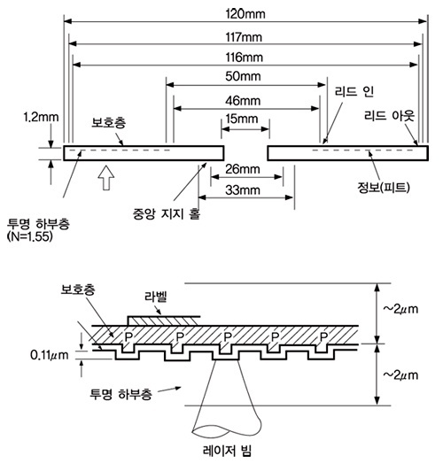 4) CD 패밀리CD는 오디오용으로 개발되었지만 800Mbyte에 달하는 저장 용량에 오랜 세월 동안 데이터를 안전하게 저장할 수 있는 능력이 있어 다양한 변종이 나타났다. 특히 CIRC 오차 교정 및 EFM 코딩을 통한 데이터 안전성이 광학 저장 매체의 장점을 잘 살려주고 있기 때문이다. 가장 많이 사용하는 것이 컴퓨터의 광학 저장 매체의 역할을 하는 CD-ROM이다. 이 CD-ROM 파일 형태로 각종 데이터 파일을 저장할 수 있다. CD-ROM 이후에 한 번 기록이 가능한 CD-R과 여러 번 기록이 가능한 CD-RW 포맷이 개발되었다. 이후에 비디오 데이터를 저장, 재생이 가능한 비디오 CD 등이 연관 관계를 지으며 개발되어 사용되고 있다. 이들 새로운 포맷이 나올 때마다 이에 관한 기술적 기준이 정해져 공표가 되는데, 이 기준 책자의 표지 색상을 다르게 해서 구분하기도 한다. 예를 들어 CD-ROM에 관한 규정은 엘로우북, CD-R에 관한 규정은 오렌지북, 비디오 CD에 관한 규정은 화이트북 규격이라고 부른다. 그 중 CD-ROM은 음악 CD 이외에 가장 많이 사용되는 포맷이다. 컴퓨터 소프트웨어 또는 컴퓨터에서 사용 가능한 데이터를 저장하는 경우가 많다. 오디오 CD와는 데이터를 저장하는 파일 포맷이 다른데, 규격 적용에 더 융통성이 많다. 하나의 CD-ROM에는 682 또는 800Mbyte의 저장 용량을 갖으며 오렌지북이라 불리는 규격은 1989년에 발표되었다.CD-R은 기록 가능한 포맷으로 공식적으로는 CD-WO(Write Once)라고 불리는데, 오렌지북 파트 2에 규정되어 있다. 이 규격은 1988년에 확정이 되었으며 한 번에 한해 기록이 가능하고, 기록된 데이터는 영원히 보존이 가능하기 때문에 오디오뿐 아니라 각종 컴퓨터 데이터의 보존 등에 사용된다. 특히 배포 수량이 작은 경우 유효하게 사용할 수 있고, 대량의 CD 제작 전에 시험 단계로 사용하기도 한다. 오디오 CD의 경우 마스터 테이프의 역할도 CD-R이 하는 경우가 많다. 일반 디지털 데이터 또는 오디오 데이터는 미리 새겨진 골을 따라 기록이 되는데, 일반 CD와 달리 기록용 레이저 빔의 강도를 조절하기 위한 PCA(Power Calibration Area)가 일반 CD의 시작점보다 -35초 전에 해당하는 내부에 위치한다. 이 부분을 사용해 레이저 빔의 강도를 조절하고 테스트해 최적의 쓰기용 레이저 빔의 강도를 결정한다. 이 외에 PMA(Programmable Memory Area)도 있는데, 이는 시작점 -13초 전의 부분에 위치하며 기록되는 데이터에 대한 트랙수와 임시적인 TOC(Table of Contents) 등이 수록된다. CD-R은 일반 CD와 같이 폴리카보네이트 재질로 되어 있지만 기록을 위해 반사 층과 하부 보호 층 사이에 유기 염료 층이 별도로 존재한다. 여러 번의 기록이 가능한 CD-RW도 있다. 이는 읽고, 쓰고, 지우기가 가능하기 때문에 여러 번 반복적으로 기록이 가능하다. 이 포맷은 공식적으로는 CD-E라고 하며 관련 규격은 오렌지북 파트 3에 규정되어 있고 1996년에 발표되었다. 반복해 쓰고, 지우기를 하기 위해 CD-RW는 알루미늄으로 된 반사 층과 기록을 위한 2개의 유전(Dielectric) 층을 가지고 있어 외관상으로는 회색으로 보인다. 기록을 위해서는 상변화(相變化) 기술을 이용하며 천 번 이상의 기록이 가능하다. CD-RW 역시 미리 새겨진 골을 따라 레코딩이 되는데, 결정질일 때는 빛을 통과하다가 비결정질로 변하면 빛을 흡수하는 은과 인듐, 안티몬 등의 재질로 만들어지는 특수 합금 층이 사용되고 있다. 이 합금 층은 8mW에서 14mW의 기록용 레이저 빔을 받으면 그 부분의 온도가 용융점 이상인 500도에서 700도가 넘어 결정질이 비결정질(Amorphous) 상태로 변한다. 이 같이 기록용 레이저 빔을 받은 부분이 CD의 피트 역할을 해 데이터를 기록하고 이를 0.5mW 정도의 읽기용 레이저를 통해 읽어 낸다. 기록된 데이터를 지울 때는 기록용 레이저 빔을 쏘며 200도 정도의 낮은 온도로 가열한 다음 천천히 식히면 다시 결정질 상태로 되돌아오는 성질을 이용한다. 이 외에도 전문적인 사진을 담는데 쓰이는 포토 CD가 있다. 이는 코닥 사에서 개발되었으며 관련 규격은 베이지(Beige)북에 규정되어 있는데, 물리적으로는 CD-R과 같지만 기록 포맷이 다소 다르다. HDTV보다 4배 이상인 35mm 필름 화상을 약 4:1로 압축해 저장한다. 직경이 80mm 정도로 작은 CD-3 규격의 CD 및 CD-R, CD-RW도 일반적으로 사용되고 있다. 약 20분 정도의 오디오를 녹음할 수 있기 때문에 CD 싱글 형태로 발매하는 데 적합하다. 특히 크기가 콤팩트하기 때문에 음악용뿐 아니라 200Mbyte 정도의 그리 많지 않는 데이터 파일을 담는데도 유용하게 사용한다. 공식적으로는 CD-3이라고 부른다.
