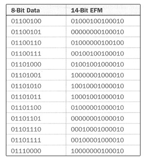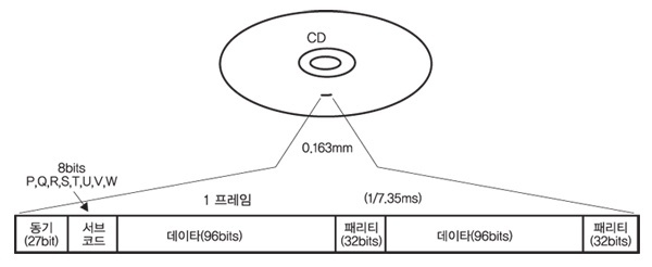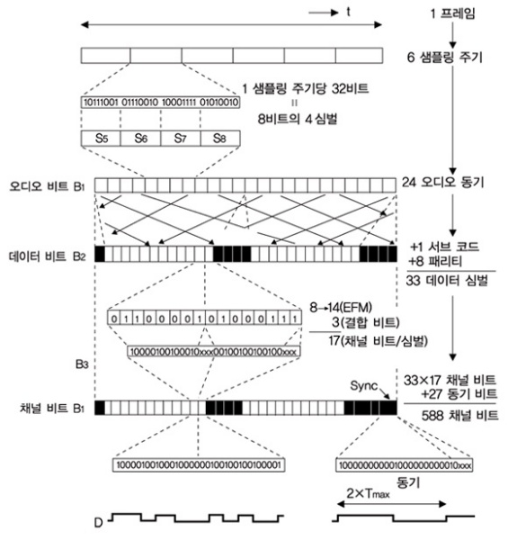 2) CD의 데이터 인코딩CD에 실제로 기록되는 디지털 데이터는 사전에 코딩 과정을 거쳐 만들어진 데이터로, 재생 시에는 다시 디코딩 과정을 거쳐 디지털 오디오 데이터로 복원된다. CD에 사용하는 디지털 오디오 데이터는 PCM(Pulse Coded Modulation) 포맷을 갖고 있는데, CD에 기록되기 전에 CIRC와 EFM 변조 과정을 거치고 여기에 제어와 동기를 위한 데이터가 추가된다. CD에 실제로 쓰인 데이터는 <그림 3>과 같이 프레임 단위로 포맷된다. 프레임은 CD 디스크 안에서 인식할 수 있는 최소의 완전한 단위이다. 프레임은 <그림 4>에서 보는 바와 같이 오디오 데이터와 오류 검사를 위한 패리티(Parity) 비트, 동기를 위한 싱크 워드 및 서브 코드로 구성되어 있다. 인코딩 과정에서 이 프레임은 6개의 32비트 PCM 데이터가 좌·우 채널 번갈아 가며 샘플링 기간에 하나의 그룹으로 모아진다. 따라서 총 192 오디오 비트가 하나의 프레임에 들어간다.이 32비트 데이터는 에러 발생할 시 이를 분산하기 위해 4개의 8비트 오디오 심벌로 나뉘어 지고, 이들은 서로 다른 프레임 데이터들과 섞이는 인터리빙(Interleaving)을 하게 된다. 여기에 8개의 8비트 패리티 심벌이 프레임마다 생성되어 각각 4개씩 프레임의 중간과 말미에 위치하게 된다. 이들 패리티 심벌의 생성과 인터리빙은 CIRC에 근거한 에러 정정 인코딩의 근간을 이루게 된다. 한편 프레임마다 하나의 서브 코드 심벌이 더해지게 되는데, 8비트의 서브 코드 심벌 중 P, Q 비트는 CD 안에 있는 콘텐츠의 선택, 각 콘텐츠의 시작과 끝이 나는 점과 인덱스 포인트의 정보를 싣고 있고, 나머지 6개의 비트들은 텍스트 인코딩이나 그래픽 정보 등 별도의 용도를 위해 마련되어 있다.오디오, 패리티 및 서브 코드 데이터들이 합해진 후에는 EFM 변조를 한다. 이 EFM 변조는 '1'과 '0'이 교대로 자주 나오는 채널 상태의 변화가 가능한 많도록 고안된 것으로, 이는 레이저 픽업의 판독 능력을 향상시켜 주며 디스크의 밀도 향상 및 스핀들 모터의 제어를 원활하게 해 주는 역할을 한다. EFM 변조는 8비트의 데이터를 14비트의 데이터로 바꾸는데, 2의 14 승(乘)이므로 '214= 16,384'개의 조합이 생긴다. 이 중 '0'과 '1'의 발생 패턴이 조건에 맞는 256(= 28)개를 골라 사용한다. <표 1>은 EFM 변조에 사용하는 변환 맵(Map)의 일부이다. 이 <표 1>에서 보는 바와 같이 '0'은 최소 3개에서 최대 7개까지 연속되는 것만 허용이 된다. EFM 변조 후 14비트로 늘어난 데이터는 추가로 3비트의 결합(Merging) 비트가 더해져 총 17비트의 데이터가 된다. 결합 비트를 더하는 이유는 데이터의 직류(DC) 성분을 억제하고 클록의 동기화를 돕기 위해서이다. 이러한 변조 과정 후에는 '0'과 '1'이 적절하게 분포되어 존재하게 되는데, 픽업의 위치에 따라 각 속도가 달라지므로 가장 긴 피트의 길이는 짧은 경우 3주기, 가장 긴 경우는 11주기 사이에 위치하게 되어 이를 3T-11T 신호라고도 부른다. 피트의 길이는 각 속도가 1.2m/s인 경우 가장 짧을 때는 CD의 가장 안쪽 부분에서 만들어지는 0.833㎛이고, 가장 바깥쪽에 위치해 가장 길 때는 3.054㎛이다. 이 3T-11T 신호는 CD 표면의 EFM 채널 변조된 신호를 나타내는데, 일단 NRZ(Non Return to Zero) 방법에 의해 코딩된 후 다시 NRZI(Non Return to Zero Inverted) 신호로 코딩되어 최종적으로 이 신호가 CD 표면에 기록되게 된다. 이 NRZI로 코딩된 신호는 극성이 바뀌어도 신호 자체의 데이터 내용은 바뀌지 않는 성질이 있다. 이러한 변환 과정을 거친 하나의 완전한 CD 프레임은 하나의 24비트의 동기용 데이터와 14채널 비트의 서브 코드, 24워드로 구성된 14채널의 오디오 데이터, 8워드로 이루어진 14채널 패리티 비트, 그리고 102개의 결합 비트로 구성되어 총 588채널 비트로 구성된다. 이 588개 비트로 구성된 프레임에는 16비트 오디오 데이터가 12개 들어가 있어 결과적으로 하나의 오디오 샘플 당 49개의 채널 비트가 필요한 셈이다. 이 때문에 CD에서는 초당 141만 개의 오디오 데이터가 위에서 설명한 여러 코딩 과정을 거쳐 432만 개의 채널 데이터로 늘어나게 되고, CD 표면에는 실제로 이 데이터가 기록되게 된다.