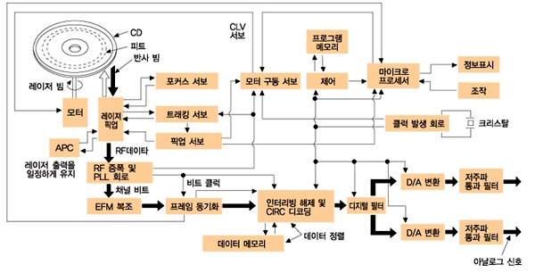 표 1. EFM 변조에 사용하는 변환 맵(Map)3) CD 플레이어의 개요CD 플레이어는 CD에 새겨진 데이터를 읽어서 오디오 신호로 변환시키는 역할을 한다. 주요 기능으로는 데이터를 읽기 위한 레이저 픽업 시스템, 정확한 광학적 트랙에 빔을 포커싱시키는 제어 시스템과 읽어 들인 신호를 디코딩해 S/PDIF(Sony Philips Digital Interface) 형식의 동축 혹은 광 출력 단자를 통해 디지털 오디오 신호를 출력시키는 동시에 이를 아날로그 신호로 바꾸어 아날로그 단자를 통해 출력시킨다. 이 중 아날로그 출력을 생략한 기기도 있는데, 이를 보통 CD 트랜스포트라고도 부른다. 전체적인 기능에 대한 개략도는 <그림 5>와 같다.광학 픽업 시스템은 사용하는 레이저 빔의 개수에 따라 원 빔 또는 쓰리 빔 시스템으로 나누어지는데, 회전하는 CD 표면에 새겨진 데이터 트랙을 정확하게 포커싱하고 트래킹해서 데이터를 읽어 내야 하므로 미크론 단위 이하의 정밀도를 요구한다. 이 픽업 시스템은 레이저 다이오드, 회절 격자판(Diffraction Grating), 편광 빔 분할기, 반사 거울 및 다수의 렌즈 등으로 구성된다. 레이저 광원으로는 5mW 정도의 출력을 내는 AlGaAs(알루미늄 갈륨 비소) 계열의 반도체형 레이저 다이오드가 사용되는데, 780㎚의 단파장으로 응집 성능이 우수해 미세한 데이터 수록 부분에서 포커싱을 용이하게 할 수 있다. CD 표면에 반사되어 나오는 레이저의 강도는 대략 0.5mW 정도이다. CD 플레이어에 사용되는 레이저 다이오드의 수명은 길어서 적어도 수천 시간에서 수만 시간 정도이다.CD의 정교한 트랙을 읽어 내기 위해 픽업을 이동시키는 제어 시스템 또한 매우 복잡하다. 계속적인 음악 데이터를 읽어 내기도 하지만 사용자가 다른 곡을 선택할 때는 즉시 해당 트랙으로 건너뛰어서 읽기를 계속 해야 한다. 이를 위해 모터 제어와는 다른 픽업 제어 시스템이 적용되는데, 리니어 모터가 사용된다. 3 빔 시스템인 경우 픽업 시스템은 초소형 썰매와 같이 생긴 슬레드(Sled)에 장착되어 CD 표면을 원주 방향으로 이동하면서 신호를 읽어 낸다. 1 빔 시스템은 스윙 암 형태로 장착되어 CD 표면을 아크 곡선을 그리며 이동하는데 과거의 아날로그 LP 플레이어의 형태와 유사하다. CD 표면의 반사율이나 제작 공정상의 상이 등으로 레이저 픽업으로 들어오는 광량에 편차가 있다. 이를 보완해 출력되어 나가는 전기 신호의 레벨을 일정하게 하기 위해서 자동적으로 출력되는 전기 신호의 레벨을 증폭시켜 주는 증폭기가 추가되어 있는데, 이득은 ±10dB 정도이다. 레이저 픽업을 통해 읽어 낸 전기 신호는 복조 및 에러 정정, 디지털 필터링과 D/A 변환 과정을 거치게 되는데, 데이터의 건전성이 확인된 신호만 아날로그 신호로 변환된다. 이외에 사용자와 인터페이스를 위한 조작·제어 부분 및 정보 표시 회로가 추가되고, 이들을 제어하기 위한 마이크로프로세서가 사용되고 있다. 레이저 픽업을 통해 읽혀진 전기 신호는 RF(Radio Frequency)의 사인(Sine) 신호 형태로, EFM 변조된 신호이다. 이 RF 신호는 먼저 증폭된 다음 PLL(Phase Lock Loop) 회로를 거쳐 시간적으로 정렬된 데이터로 가다듬어진다. 이 데이터는 EFM 복조 회로를 통해 디코딩되는데, 이 과정에서 버퍼 메모리가 같이 사용되어 입력되는 데이터가 에러가 있을 경우에 대비한다던지, 후에 나오는 디인터레이싱(Deinterlacing) 과정에 사용된다. 이 버퍼 메모리가 넘치거나 비게 되지 않도록 CD의 회전 속도를 조절해 적정량의 데이터가 남아 있도록 제어된다. EFM 복조를 마친 데이터는 CIRC 알고리듬에 의해 에러 검출 및 정정이 이루어진다. CIRC 에러 정정 디코딩은 C1과 C2라고 불리는 두 개의 리드 솔로만(Reed Soloman) 코드를 사용한다. 여기에 패리티 비트와 디지털 데이터의 인터리빙을 사용한다. 이 CIRC 코딩을 통해서 최대 3874비트(피트 트랙의 2.5mm 크기에 해당)에 달하는 에러를 교정할 수 있다. 실제적으로 이 정정 가능한 에러 범위를 넘는 에러가 발생할 때는 레이저 픽업의 트래킹이 제대로 되지 않는다. 일반적으로 CD의 에러 발생 확률은 BER(Bit Error Rate)로 표시하는데, 10-5 내지 10-6 정도이지만 CIRC 코딩을 통하여 이를 10-10내지 10-11 정도로 낮춘다. 이는 에러 발생 확률이 100억 비트 당 한 개 이하로 발생하는 정도이다. 이는 CD가 워낙 많은 데이터를 갖고 있기 때문에 약간의 CD 표면 상처로도 많은 양의 데이터가 손상되는 것을 보상해 준다. CIRC 회로에 있는 두 개의 C1, C2 회로 중에서 C1 회로는 경미한 에러를 정정하고, C2 회로는 더 넓게 퍼진 에러를 에러 검출 플래그(Error Flag)의 도움으로 정정한다. 이 과정을 통해서도 정정되지 못한 에러는 에러 검출 플래그를 생성하고 이 에러 사이의 양쪽 부분은 보간(Interpolation)하거나 묵음(默音) 처리해 귀에 거슬리는 잡음이 발생하는 것을 막는다. 하지만 CIRC 회로를 통해 발견하지 못한 에러가 있을 경우는 '탁탁' 하는 특유의 잡음이 들릴 수도 있다. 에러 정정 회로 이후에는 디지털 데이터에서 서브 코드 정보가 추출되어서 제어나 부가적인 정보 제공에 사용된다. 디지털 영역을 빠져나오기 전에 마지막으로 오버 샘플링 방법에 의한 디지털 필터링 처리 과정을 거친