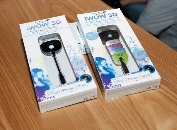 평일인데도 불구하고 많은 이들이 자리했다. 그만큼 SRS에 대한 관심이 큰 것이다. 실제로 SRS는 돌비, THX, DTS 등과 함께 최고의 음장 기술을 보유한 업체 중 하나이다. 국내에서는 SRS WOW HD 음장이 유명한데, 미디어 플레이어에서 엄청난 반응을 이끌어내기도 했다. SRS에 대한 소개가 이어지고, 본격적인 신제품 소개가 진행된다. SRS iWOW 3D는 아이폰과 아이패드에 연결할 수 있는 어댑터이다. 작은 크기이기 때문에 쉽게 장착할 수 있고, 원 버튼으로 심플하게 구성되어 있다. 기본적으로 프리셋을 선택할 수 있는 어플을 제공하고, 와이드 서라운드, 딥 베이스, 하이 트레블 등을 설정할 수 있다. 5가지 색상의 컬러 플레이트를 제공하여, 핸드폰 케이스와 같은 색으로 구성할 수 있는 편의성도 제공한다.