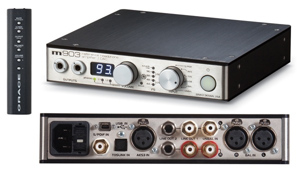 3세대 M903의 가장 두드러진 변화는 DAC다. 이전의 M902는 앰프부는 분명 뛰어났지만, USB 입력 시의 DAC 성능은 발매된 지 오래되어 솔직히 그리 우수하지 못했다. 그렇지만 이번 M903의 DAC는 일취월장하여 비동기 전송 모드를 지원하는데, 이는 최근 오디오퀘스트의 드래곤플라이 설계자로 명성이 높은 웨이브렝스 오디오의 고든 랜킨의 원천 기술을 라이선스 받아 사용하는 것이라 한다. 그리고 최대 192kHz까지 디코딩 가능하며, USB 포트는 오디오 서킷과 분리되어 있어 PC로부터 유입되는 노이즈를 원천적으로 차단한다. 그리고 아날로그 입력이 선택되면 디지털 서킷에 들어가는 전원을 아예 차단시킨다. 아날로그와 디지털을 함께 다루는 앰프가 갖추어야 할 덕목을 충실하게 지키고 있는 제품인 것이다. 그간 그레이스 디자인은 구동이 까다롭다고 평가받는 젠하이저 HD800 등과 매칭이 우수하다고 알려지고 있는데, 마침 필자의 시청실에 젠하이저 HD800과 HD700이 있어 테스트 시에 이를 매칭할 수 있었다. M903이 구동하는 젠하이저 HD800은 이보다 더 좋을 수 없다 할 정도로 뛰어나다. 특히 중·저역을 두툼하게 표현해 내는 질감은 마치 진공관 헤드폰 앰프를 매칭한 듯한 매력을 뿜어내며, 경쟁 모델과 비교 시에도 고역의 해상력과 뉘앙스는 다소 아쉽지만 중·저역의 표현력과 타격감은 M903의 완전한 우위다. 특히 HD700의 경우에는 HD800보다 다소 음이 포워드하게 쏟아져 나오지만 더 강력해진 중·저역의 파워로 음악의 열기를 생생히 전달하는 표현력이 대단히 매력적인 매칭이었다. 재미있는 점은 M903은 헤드폰 입력이 2구로 헤드폰 비교 테스트를 자주 하는 사용자에게 상당히 요긴하게 쓸 수 있다는 점이며, 반면 아쉬운 점은 USB 커넥터 규격을 여느 DAC와 달리 미니 B타입을 채택해 기존에 쓰던 케이블을 그대로 쓰지 못하고 새로 구입해야 한다는 것이다. 그레이스 디자인 M903은 구동이 어려운 헤드폰의 난제를 단번에 해결해 줄 수 있는 수작으로, 헤드파일러라면 꼭 한 번은 경험해 보아야할 헤드폰 앰프의 스탠더드라 할 수 있다.