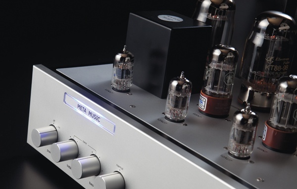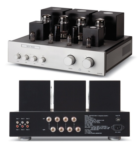 이번에 만나게 된 펜토드 5000X 진공관 인티앰프는 그동안 수없이 연구하며 시험했던 모든 노하우를 남김없이 반영하면서 사용하기에 편리하고 효율성이 아주 뛰어난 앰프를 만들겠다는 메타 뮤직 사운드의 강력한 의지가 담겨져 있는 앰프다. 진공관 앰프의 심장이라고도 말하는 트랜스는 2006년부터 자체 개발에 착수, 정말로 많은 실험과 시행착오를 경험하며 완성도를 높여 나갔다고 하는데, 그때의 열정은 끔찍하기까지 했다고 말한다. 덕분에 음의 안정성과 회로 등 기술적인 완성도를 기대할 수 있게 되었다는데, 펜토드 5000X의 트랜스는 외모부터 듬직하고 믿음직스럽게 보인다. 알루미늄으로 가공된 전면 패널에는 왼편 상단에 메타 뮤직이라는 로고가 있으며 전원을 켜면 은은하게 불빛이 보인다. 그 하단에는 맨 왼쪽으로 전원 스위치 노브가 있으며, 바른쪽으로는 요즈음엔 잘 채용하지 않는 트레블과 베이스 2밴드의 톤 컨트롤 노브가 있다. 트레블에서는 0-9dB까지, 10kHz 이상에서 12dB까지이며, 베이스에서도 0-9dB까지, 100Hz이하의 주파수에서 12dB까지 컨트롤이 가능하게 설계되어 있어 음을 세팅하는데 편리하다. 또 그 바른편에는 좌우의 밸런스를 조절할 수 있는 밸런스 노브가 장착되어 있는데, 정밀하고 아름답게 잘 정리되어 있다. 맨 오른쪽에는 큼직하여 손쉽게 조절할 수 있는 입력 실렉터 노브가 있으며, 그 왼쪽으로는 동일한 크기와 모습이 같은 볼륨 노브가 자리 잡고 있다. 채용된 진공관은 12AX7×2, 12AU7×2 6SN7×2, 출력관으로는 KT88 4개를 사용하여 채널당 정격 50W를 보장하며 6550관도 사용 가능하다. 입력 라인은 3조의 언밸런스 단자가 채용되어 있으며, 출력 단자는 4Ω·8Ω·16Ω3조의 바인딩 포스트 단자가 준비되어 있다. 그리고 펜토드 5000X에는 인터 스테이지 트랜스가 채용되었으며, 밸런스 볼륨과 고 헨리 초크를 사용하고 있다. 설명서에 '여타 앰프와는 전혀 다른 인티앰프를 소개합니다'라고 강조하고 있는데, 외모에서부터 안정되고 단정한 모습이 믿음직하다.