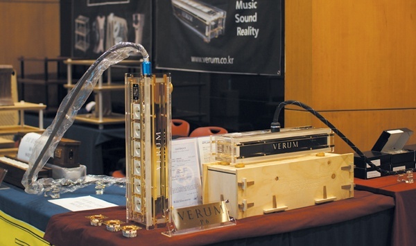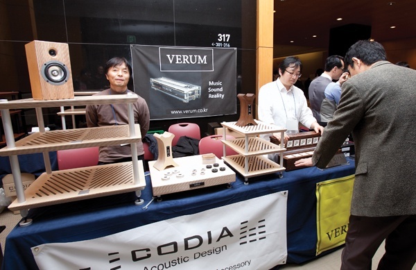 베럼어쿠스틱/코디아 혁신적인 설계와 엄선한 재료로 자체 생산한 부품을 사용해 오디오파일을 위한 액세서리를 전문으로 제작하는 업체 베럼어쿠스틱은 멀티탭 P6, W6과 케이블 진동 방지 댐퍼를 소개했다. 하이파이 오디오 랙을 생산하는 코디아는 음향적인 측면을 고려해서 디자인하며, 설비를 갖춰 제작·도장까지 전부 자사에서 직접한 자작 합판을 사용한 오디오 랙을 선보였다.