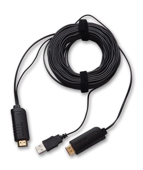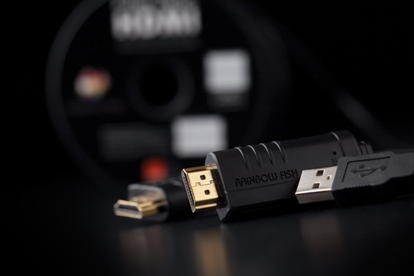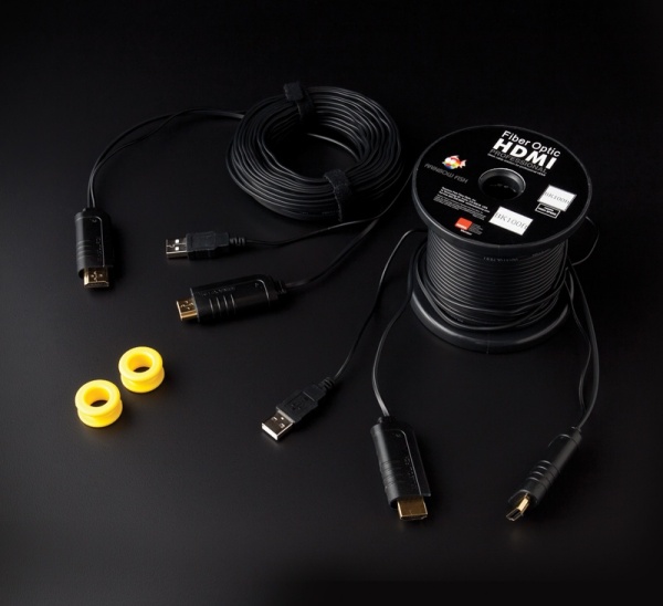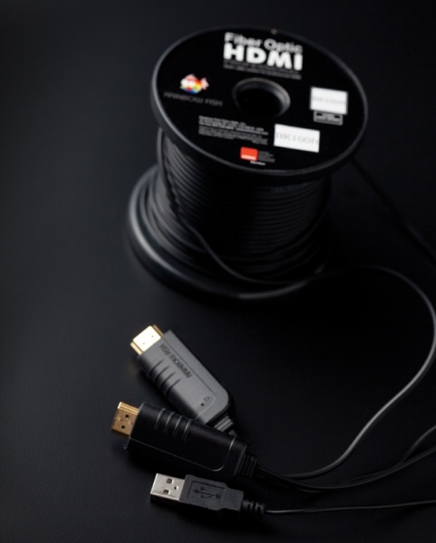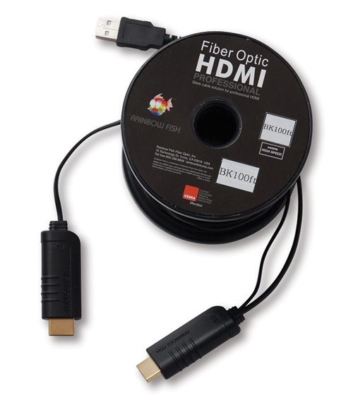레인보우 피쉬의 파이버 옵틱 HDMI 케이블은 광섬유 기술을 이용해 고화질 음성, 비디오, 데이터 등을 전송하는 제품인데, 이 케이블은 HDMI 하이 스피드 인증을 받은 제품으로, 16Gbps의 넓은 대역폭으로 1080p·3D·4K·딥 컬러 비디오까지 지원하고, HDCP·EDID·CEC 기능도 지원한다. 그리고 광섬유로 제작되어 전자기 장해(EMI)를 받지 않으며, HDMI 신호 전송 거리 제한 문제를 해결해 길이가 길어져도 신호 열화와 감쇄가 일어나지 않는 특성을 가지고 있다. 그리고 일반적인 구리 HDMI 케이블보다 얇고 가늘어 사용이나 설치가 매우 편리한 장점이 있다. 광 HDMI 케이블이라 일반적인 HDMI 케이블과는 매우 다른 모습을 볼 수 있는데, 우선 이 제품은 일반적인 HDMI 케이블과 사용하는 방법이 다르다. 우선 DVD 플레이어, 블루레이 플레이어, 셋톱박스, 컴퓨터, 비디오 게임기와 같은 소스기기의 HDMI 단자에 TX라고 쓰여 있는 커넥터를 연결한다. 그 다음 TV, 모니터, 프로젝터와 같은 디스플레이의 HDMI 단자에 RX라고 표시된 커넥터를 연결한다. 그리고 TV와 같은 디스플레이에 부착된 USB 단자에 RX 커넥터와 연결되어 있는 전원용 USB 케이블을 연결한다. 이 케이블은 이렇게 전원이 필요하기 때문에 TX 쪽에는 0.6W, RX 쪽에는 0.5W의 소비전력이 필요하고, USB 쪽에는 DC 5V 전압이 필요하다.
