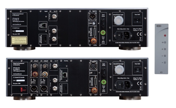 C1 역시 같은 사이즈 같은 모양이다. 여기서 노브는 말 그대로 볼륨, 뒤쪽 노브는 입력 선택이다. CH 프리시전의 제품은 뒷면을 보면 마치 이전의 첼로나 방송·프로용 장비와 같이 PC처럼 보드를 추가할 수 있는 구조로 되어 있다. 여기서 다양한 옵션이 가능하다. 또한 양쪽 기기 모두 뒷면에 외부 전원 단자가 있어 향후 전원부 업그레이드도 가능하여 보인다. D1은 아직 진화 단계의 기기. 리뷰를 하면서 찾아보니 USB로 DSD 재생은 물론 DSD 스트리밍 플레이도 가능하고, 보드를 추가하면서 모든 포맷의 다양한 방식의 컨트롤이 가능하다. 또한 아날로그 입력단을 추가하면 아날로그 신호를 DSD128(5.6MHz)로 변환되어 처리된다. 말 그대로 모든 신호의 디지털 컨트롤 센터인 것이다. 이번에 마련된 C1는 아쉽게 기본적인 보드만 있어 USB 입력, 네트워크 스트리밍 플레이 등은 해보지 못하였다. D1에 CD를 올리고 동사 전용 방식인 CH 링크를 통하여 C1으로 신호를 보낸다. 전형적인 스위스 풍의 하이엔드 사운드이다. 시청하면서 오르페우스 또는 바이스의 DAC와 맥을 같이 한다는 느낌을 받았는데 찾아보니 CH 프리시전 이전에 개발자는 이들에 어떤 식으로든 연관이 되어 있는 전력을 알 수 있었다. 뜬금없이 나타나 비싼 기계 내놓고 하는 신생은 아니라는 이야기. 이미 모두 시장의 검증을 받은 명작을 만들어 내던 사람들이다.