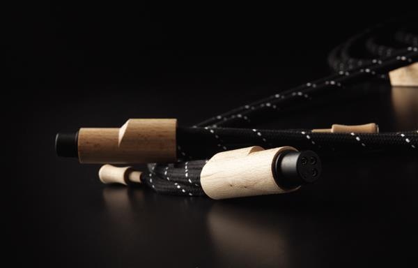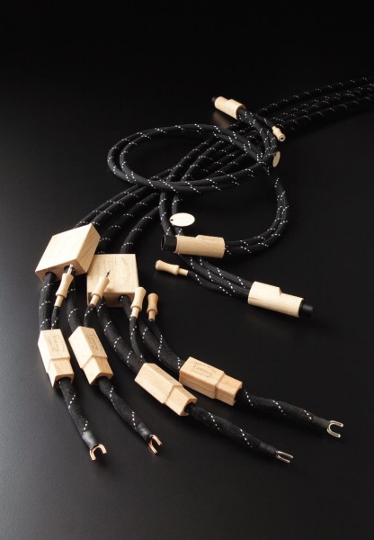이번에 시청한 콘스탄틴 2010 XLR 케이블도 그렇다. 보통 RCA나 XLR 커넥터의 모습은 금속으로 되어 있는데, 이 케이블의 단자는 나무로 되어 있다. 그리고 각각의 신호 선을 한 가닥씩 분리해 두 가닥으로 분리하였고, 한쪽 끝에는 그라운드 선까지 달려 있다. 이 그라운드 선을 잘 연결하면 더 선명하고 깨끗한 소리를 들을 수 있다고 한다. 이런 모습은 함께 시청한 챌린저 2010 스피커 케이블도 마찬가지다. 나무 단자와 면 피복, 그라운드 선, 그리고 나무 진동 방지 액세서리가 달려 있다. 특이한 점은 바이와이어링 구성으로 되어 있는데 (+)선과 (-)선은 각각 분리되어 있으며, (+)단자는 은으로 되어 있고, (-)단자는 구리로 되어 있다.