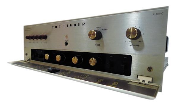 이번에 다루고자 하는 피셔 인티앰프는 바로 X-101C이다. 101C는 피셔 100 시리즈의 최고봉으로 필자가 선호하는 인티앰프다. 101C의 특징은 볼륨 컨트롤과 실렉터를 제외한 저 사용 빈도의 컨트롤 파트는 전면 하단에 힌지 보드 안쪽에 내장했다는 것이다. 그러니까 겉보기에는 매우 단순한 패널 구조로 심플한 매력이 있다. 그리고 하부 힌지 패널을 젖히면 무언가 숨겨진 비밀이 나타날 것 같은 기대감을 주는 것에 상당히 끌린다. 하단 힌지 패널의 중앙 손잡이(피셔 제비 마킹이 있다)를 아래로 살짝 눌러 젖히면 거기에 숨겨진 노브와 스위치류가 대칭으로 자리하고 있다. 패널 안쪽에 그 스위치류의 기능이 그림으로 설명되어 있고, 샴페인 골드 문자가 프린팅되어 낭만적이다. 특히 이퀼라이제이션 스위치가 테이프와 포노 중 선택이 가능해 테이프 헤드 입력과 포노 입력을 유용하게 활용할 수 있다.