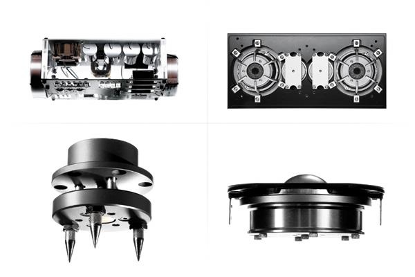 에비던스 플래티넘은 겉으로는 하나의 스피커처럼 보이겠지만 실제론 3개의 쳄버로 나뉜다. 베이스 섹션 2개와 중·고역을 위한 섹션 1개이다. 이것은 앞서 설명한 것처럼 더 큰 스케일의 저음을 재생하기 위해선 그만큼 캐비닛이 스트레스를 받는 것은 필연적인 문제이다. 이런 진동의 흐름이 중·고역을 위한 모듈에 유입되어선 안 된다. 그렇기에 일반적인 모델은 하나의 캐비닛으로 설계하지만 에비던스 플래티넘은 3개의 섹션으로 설계되는 것이다. 그런데 진짜는 여기에 있다. 이런 진동의 흐름을 끊기 위해 15cm 더블 미드레인지 드라이버와 2개의 에소타 트위터가 40mm 두께의 통 알루미늄 판재에 고정된다는 것이다. 실제 질량으로 따지면 엄청난 규모이다. 그렇기에 높은 볼륨에서도 저역의 레벨과 상관없이 중·고역의 드라이버는 더 정확한 피스톤 모션을 통해 정확하고 투명한 재생음을 낼 수 있는 것이다. 하지만 실제 내부 사진을 관찰해 보면 에비던스 플래티넘은 유닛을 배플에 마운트하는 방식부터 다르다는 것을 알 수 있다. 얼티밋 레벨의 볼트의 조임에 따라 댐핑값이 달라진다. 이것이 소리로도 나타나는데 미드레인지 드라이버의 볼트 체결이 40mm 알루미늄 패널 뒤에서 이뤄진다. 프레임과 배플의 밀착이 자연스러우면서 강한 고정을 이뤄, 유닛이 알루미늄 배플에 의한 강압적인 댐핑이 일어나지 않는다. 이는 곧 무척 자연스러운 재생음으로 이어진다. 트위터 역시 마찬가지다. 유닛에 직접적으로 고정되지 않으며, 후면에 넓은 패널이 4점식으로 배플에 고정된다. 이 또한 배플의 전면 프레임에 직접 체결되는 방식과 다른 음색을 만들어낸다.