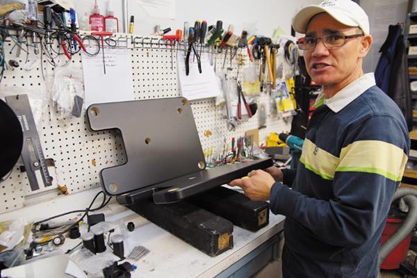 이 공간에는 몇 사람의 부스로 나뉘어 있다. 처음 들른 곳은 리오의 부스로, 지금 한참 스카우트 마스터의 어셈블리 작업 중이었다. 두터운 베이스 사이에 알루미늄 패널을 끼워서 조립하는 모습이다. 그가 주로 담당하는 것은 플래그십 모델로, 특히 클래식 시리즈는 그의 손을 꼭 거쳐야 한다.