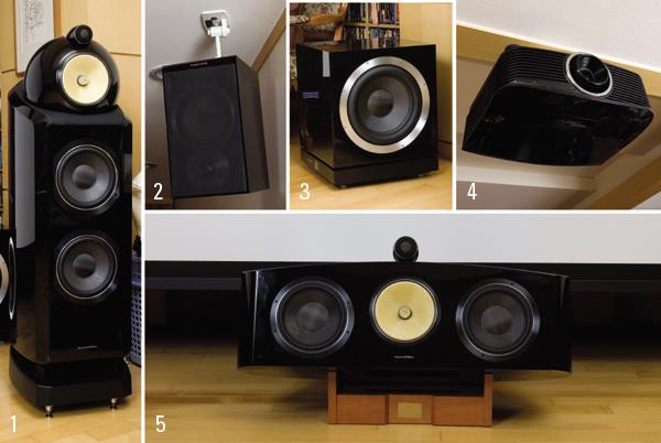 DB1 서브우퍼는 12인치 2조를 채용한 신형 제품으로, 특히 이번 B&W에서 큰 혁신을 이룬 저역의 반응 속도에서 압도적인 성능을 보여주었다. 리어 쪽에 사용 중인 에어리어 어쿠스틱스의 SW12 서브우퍼 대비 반응의 속도감에서 우위를 보여 전면 서브우퍼로 배치되었다. 구조상 플로어스탠딩형 리어 스피커의 설치가 불가능한 상황으로, 리어 스피커의 선정에 상당한 고심을 거듭하게 되었으며, 일단 음색적 통일감을 위해 B&W의 CM5 스피커를 선택했으며, (잡지사의 촬영 후) 최근 밀도감과 서라운드적 입체감의 보강을 위해 바이폴라 타입의 에어리얼 어쿠스틱스의 SR3 스피커를 도입하여 기존의 CM5는 리어백 스피커로, 에어리얼 어쿠스틱스의 SW12 서브우퍼를 후면 서브우퍼로 전면 DB1과 대각 배치하여 7.2채널 스피커 시스템을 완성했다. 특히 바이폴라 타입의 리어 스피커의 경우 적어도 입체적 서라운드 재생 측면에서는 어떤 플로어스탠딩 스피커 제품보다 우수한 특성을 보여주어 큰 만족감을 주고 있다. 또한 2개의 서브우퍼의 배치는 단지 스케일감 측면의 우수성 외에 구조상 발생되는 파장의 스탠딩 웨이브 현상을 원천적으로 봉쇄할 수 있는 배치로 저역 특성의 폭 넓은 대역 재생과 맑고 정확한 사운드를 얻을 수 있게 되었다.