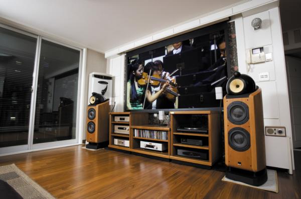 중간에 한 번 이사를 하게 되면서 큰방 하나를 완전히 AV 룸으로 꾸며보게 되었다. 도배 자체를 검정색 비슷한 것으로 하고, 전기도 새로 끌어 오고, 암막 커튼도 설치하는 등 엄청 노력해서 꾸몄다. 그러나 거의 사용하지 못했다. 약간 오디오에 흥미를 잃기 시작했기 때문이다(사실 많은 사건들이 있어서 취미 생활을 할 수 없는 시절이었다. 나의 오디오 생활에 일종의 암흑기가 되었다). 그러다가 2006년 가을에 현재의 아파트로 이사를 오게 되었다. 이 시점에서 나는 AV와 하이파이의 통합을 확실하게 포기했다. 양쪽 모두 추구해서 만족하려면 정말 많은 자금이 필요할 것 같았다. 운이 좋아서 이사 오기 전까지 3개월 정도 인테리어를 꾸밀 수 있는 시간이 있었다. 거실을 설계하기 시작했다. 벽에 전깃줄을 넣고, 스크린 박스도 만들고, 필요한 곳에 영상 케이블과 음성 케이블을 인입하는 등 작업들이 너무너무 재미있는 과정이었다. 그래서 완성된 것이 현재의 우리 가족의 놀이 공간이다. 전면에는 하이파이와 관련된 모든 기기들과 AV 리시버가 존재하고, 사진에는 없지만 왼쪽 공간에는 비주얼에 관련된 모든 장비가 존재한다. TV, DVD, 블루레이 플레이어와 엑스박스360, PS3, HD 튜너, Tvix, BS 튜너, DVHS, 각종 실렉터 등이 있다. 머리 위에는 프로젝터를 달았다. 우리 집 거실에는 줄이 하나도 안 보이는 것이 특징이다. 처음부터 그렇게 설계했다. 지저분하게 보이지 않는 것이 첫 번째 목표였기 때문이다. 물론 고수들이 보기에는 음악적 요소들이 많이 결여되어 있겠지만, 나의 선택이 옳은 선택이었다고 믿는다. 이 공간은 우리 가족들이 함께 24시간 지내는 곳이기 때문이다.