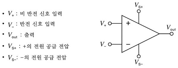 OP AMP의 회로적 표현은 <그림 1>과 같고, 각 기호의 의미는 <그림 1>의 설명과 같다. 회로의 해석 과정에 중요한 영향을 미치지 않을 경우 공급 전압 기호는 생략되는 경우가 있다.