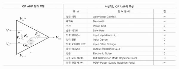 이상적 OP AMP는 다음 특성을 갖는다. 즉, 이득은 무한대. 대역폭도 무한대. 위상차는 없으며, 슬루 레이트는 무한대로 커서 고주파 특성도 우수하고, 입력 임피던스도 무한대로 커서 어떤 입력이든 받을 수 있다. 한편 출력 임피던스는 0이어서 어떤 부하이든지 구동하기 쉽다. 입력 전류는 0. 오프셋 전압도 필요 없으며, 잡음도 0. 또한 공통 모드 제거비(CMRR)와 전원 전압 제거비(PSRR)도 무한대여서 공급 전압의 리플이나 잡음의 영향을 받지 않는다. 이를 표로 정리하면 <표 1>과 같다.