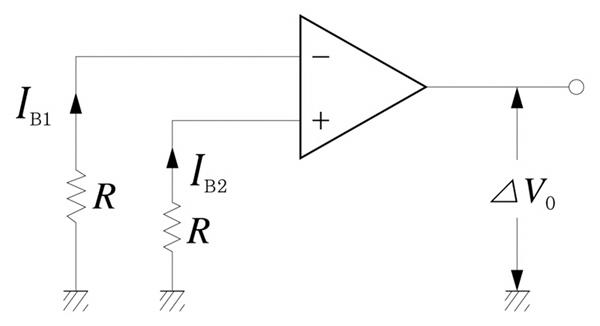 우선 입력 전류에 따른 오프세트를 설명하기 위해 <그림 3>과 같이 저항을 통해 두 개의 입력이 접지되어 있는 경우를 보자. 이 두 개의 입력에 연결된 저항치가 완전히 같은 값을 가지고 있다고 해도 OP AMP의 내부의 소자의 미세한 차이에 의해 두 입력 단자에 흐르는 전류도 차이가 발생한다. 이 두 개의 입력 단자에 흐르는 바이어스 전류의 차이를 입력 오프세트 전류 IIO라고 하며, IIO = IB1 - IB2 로 계산된다. 여기서 IB1은 반전 입력 바이어스 전류이고, IB2는 비 반전 입력 바이어스 전류이다.