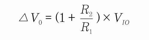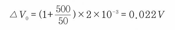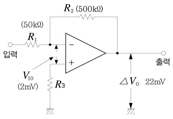 예를 들어 <그림 5>와 같이 741의 입력 오프세트 전압이 2㎷이고, R1은 50KΩ, R2는 500KΩ이라고 할 때 출력 오프세트 전압 △V0는 22㎷가 생긴다. 이는 다음 식으로 계산할 수 있다.