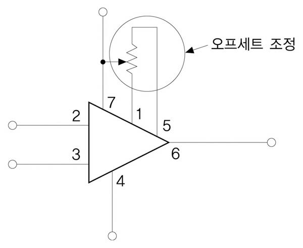 이 출력 오프세트 전압은 이득이 클수록 더 많이 나타나게 된다. 이를 없애기 위해서는 <그림 6>에서 보는 바와 같이 외부에 반고정 저항을 오프세트 조정 핀에 붙여 출력 오프세트 전압을 0으로 만든다. 현재는 오프세트 조정 핀이 없는 OP AMP가 많으며, 특히 듀얼 이상의 것은 오프세트 조정 핀이 없는 것이 일반적이다. 따라서 출력 오프세트 전압을 되도록 줄이기 위해서는 최신의 OP AMP를 사용하는 것이 좋다. 입력 오프세트 전류에 의한 △V0와 입력 오프세트 전압에 의한 △V0는 출력단에서 중첩해서 나타나게 되는데, 입력 오프세트 전류에 의한 영향이 좀더 크므로 이 부분에 좀더 주의를 기울여야 한다. 오프세트 조정을 할 수 있는 OP AMP는 종류에 따라 +전압을 가해 주는 것과 -전압을 가해 주는 것이 있으므로 데이터 시트를 참조해서 설계해야 한다.