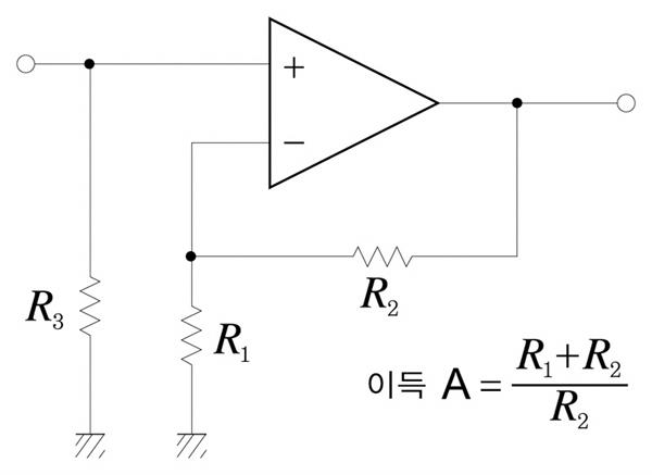 다음 식으로 계산되며, 여기서 R1은 입력 저항, R2는 귀환 저항이다.