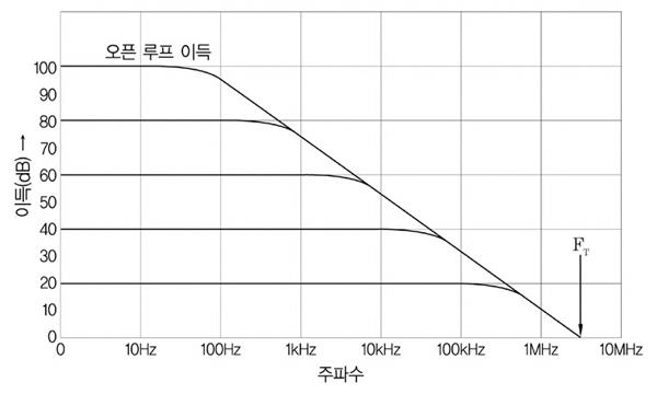 이득 설정에 있어 수십 배의 이득 설정은 위의 식을 사용하면 되지만 이득을 100배 정도로 크게 하려면 주파수 특성에 주의해야 한다. 이득이 크게 될수록 사용할 수 있는 주파수 대역은 좁아지는데, 이는 <그림 8>과 같이 이득 및 주파수 특성과 슬루 레이트가 연관 관계가 있기 때문이다. 비교적 낮은 주파수부터 6dB/oct 정도의 슬로프로 얻을 수 있는 이득이 내려간다. 자세한 것은 뒤의 슬루 레이트 편에서 설명한다.
