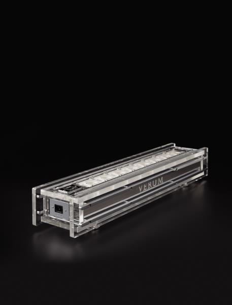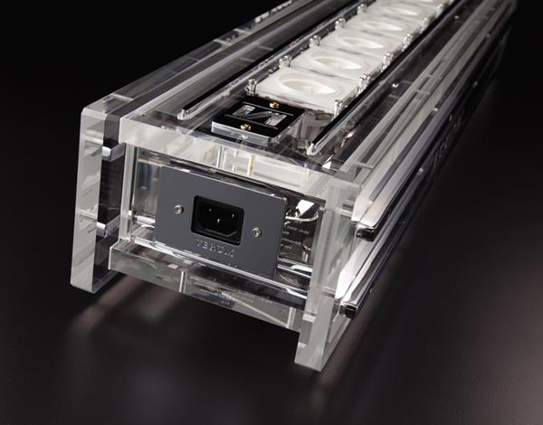 베럼 어쿠스틱 P-8 멀티탭은 동사의 최상위 멀티탭으로, ‘극사실주의’ 음향을 지향하기 위해 도체와 재료를 엄선한 최상위급의 자재를 사용했다. 이 멀티탭에 전원을 공급하는 별도의 파워 케이블을 연결하는 AC 인렛은 극저온 및 탈자기 처리된 금속 핀에 유리 섬유가 포함되어 있어 전기적 특성 및 내열, 내구성이 우수한 사출물로 성형된 후루텍 FI-09 인렛을 사용했다. 총 8개의 소켓은 독일 슈나이더 그룹의 머튼 인서트 소켓 단자를 사용했고, 도체 부분을 별도로 귀금속 도금 전문가에게 의뢰해 화이트 골드로 도금 처리를 했다. 후루텍 인렛과 머튼 소켓의 연결 도체로 S.F.A.(무산소동과 극상의 은을 합금한 소재) 원판을 6AWG 굵기의 부스바로 만들어 사용해 전원의 열화 없이 순도 높은 전원이 흐르도록 추구했다. 이외에도 전자기기 방사 노이즈를 최소화하기 위해 기판 양측 면에 백금으로 도금한 무산소동 판으로 이중 실드를 했고, 15T 두께의 독일산 신재 아크릴을 사용해 외부 진동과 공진을 최대한 억제했을 뿐만 아니라 보는 즐거움까지도 주고 있다. 또한 바닥과의 공진을 억제하기 위해 합금을 절삭 가공해서 만든 인슐레이터를 부착했고, 그 바닥 면에 천연 가죽 폼 패드로 마감 처리해 미끄러움을 방지해 놓았다.